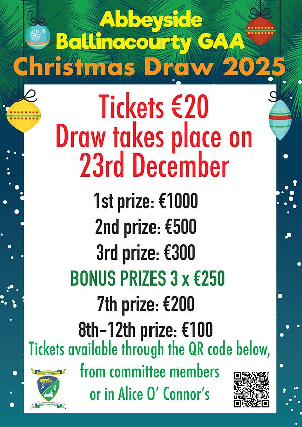 The draw will take place in Alice O' Connors Bar, Abbeyside tomorrow evening, Tuesday 23rd December.